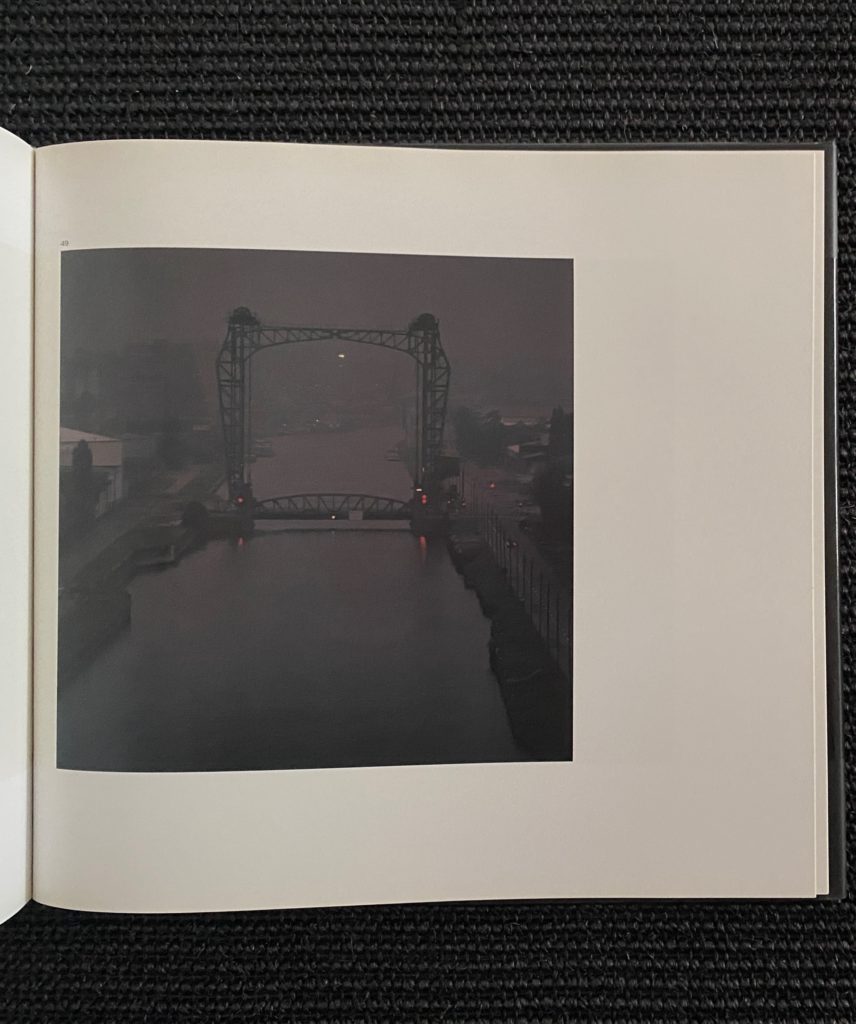 Cartonnage d’éditeur noir avec titre imprimé en blanc et en gris, sous jaquette photographique.