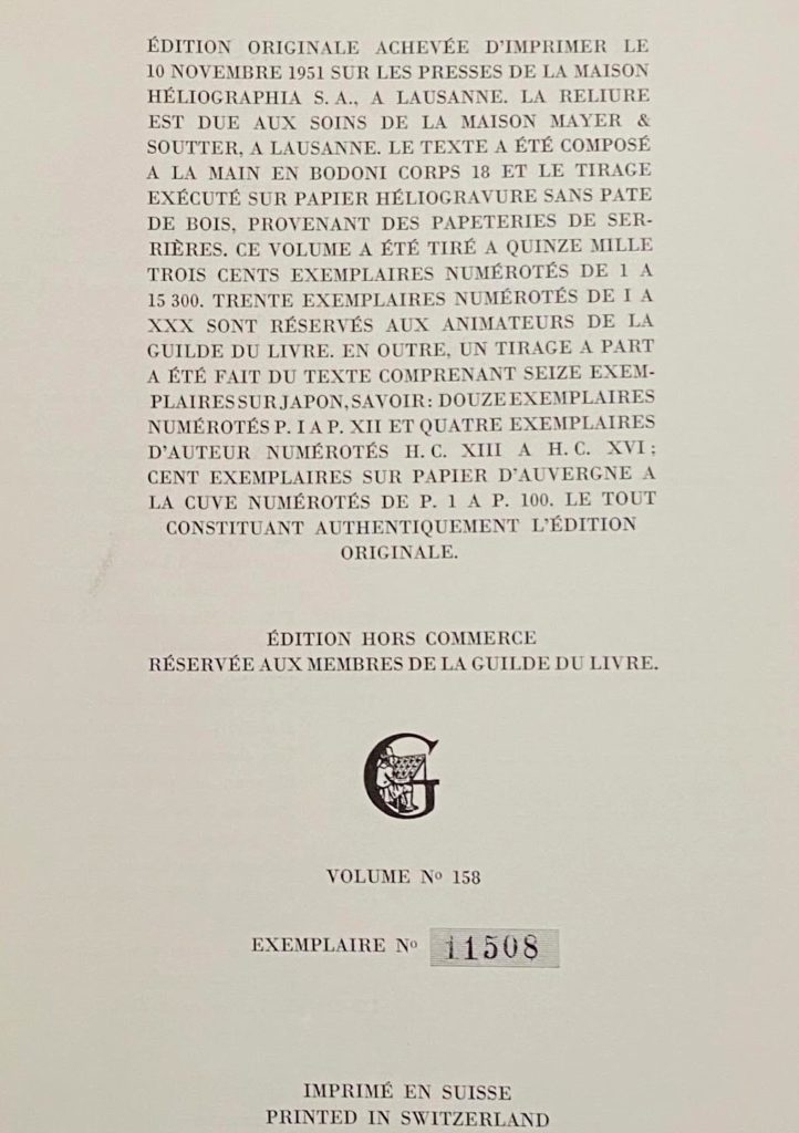 Edition originale. Volume hors commerce réservé aux membres de la guilde du Livre. 15.000 exemplaie numérotés. Cet exemplaire porte le n° 11508