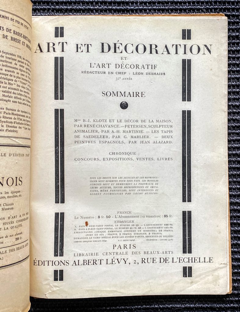 Egalement dans ce numéro : un article sur l’architecte-décoratrice Blanche -Jeanne Klotz ( 12 pages, 12 illustrations ) et un article sur le sculpteur animalier Armand Petersen ( 4 pages, 5 illustrations ).
