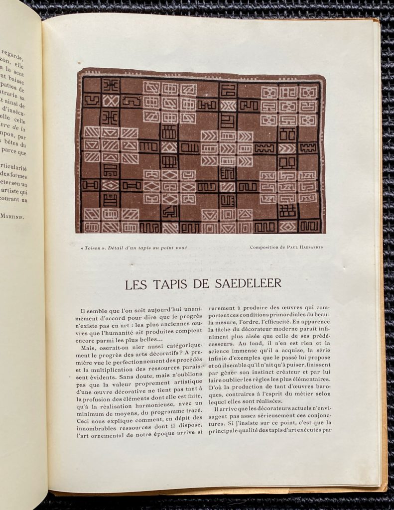 Une partie de ce magazine ( 8 pages avec 12 reproductions ) est consacrée aux tapis d’art au point noué confectionnés par le « Studio De Saedeleer » à Etichove-lez-Audenarde en Belgique .