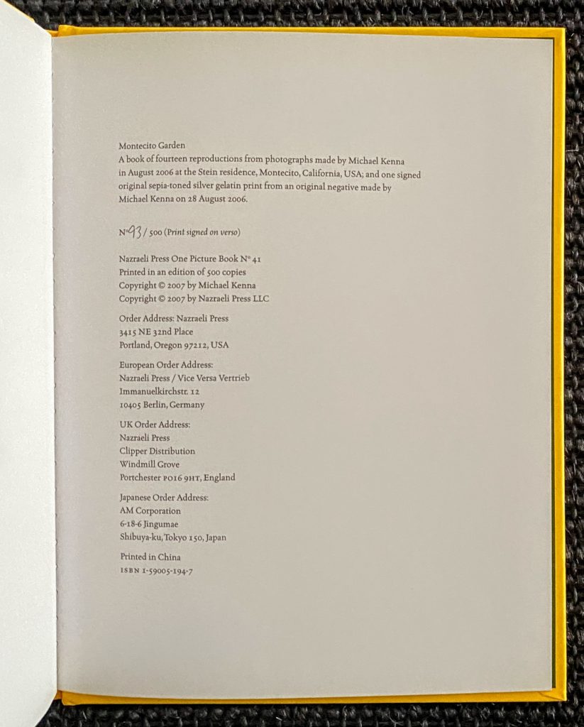 Hardcover, 16 pages with 14 duotone plates and one original sepia-toned gelatin silver print ( 12 X 12 cm ) from an original negative made by Kenna tipped in the final page signed and dated ( 2006 ) in gray pencil on verso.