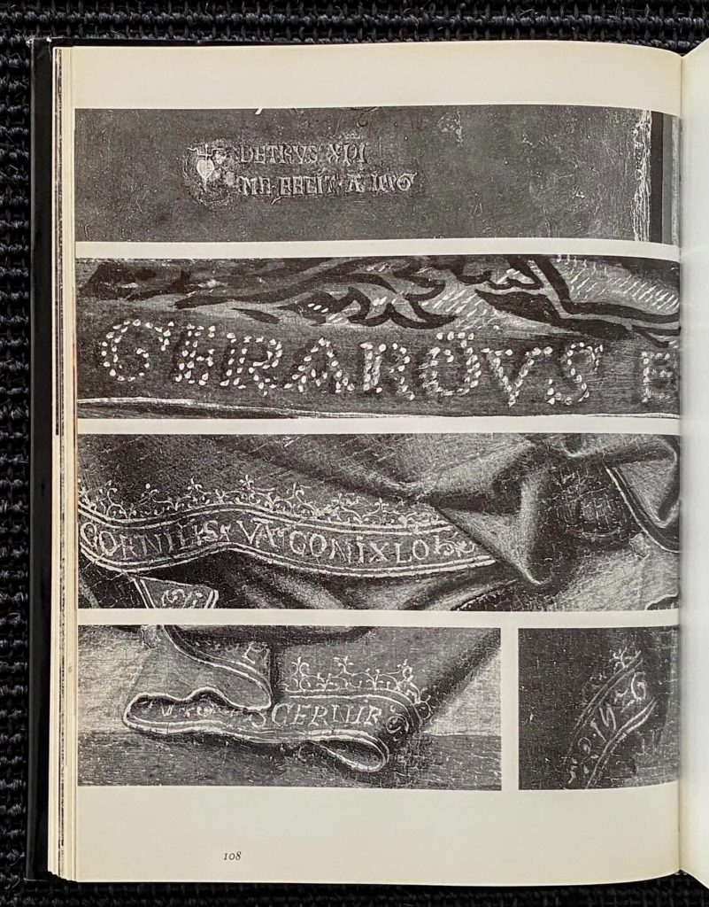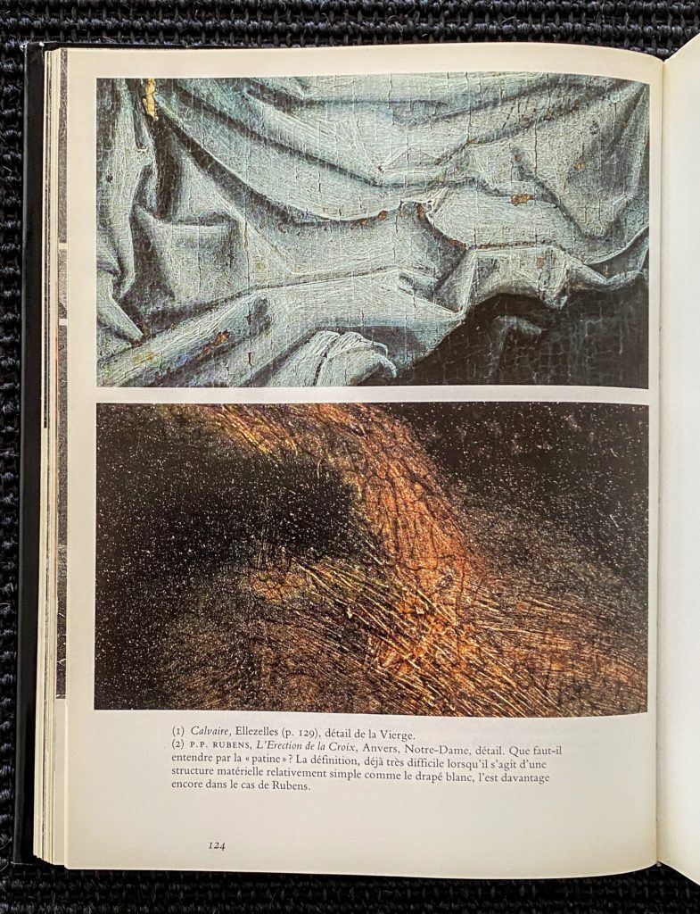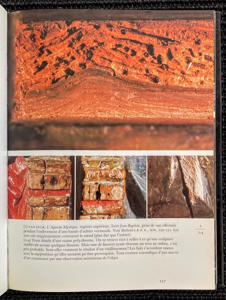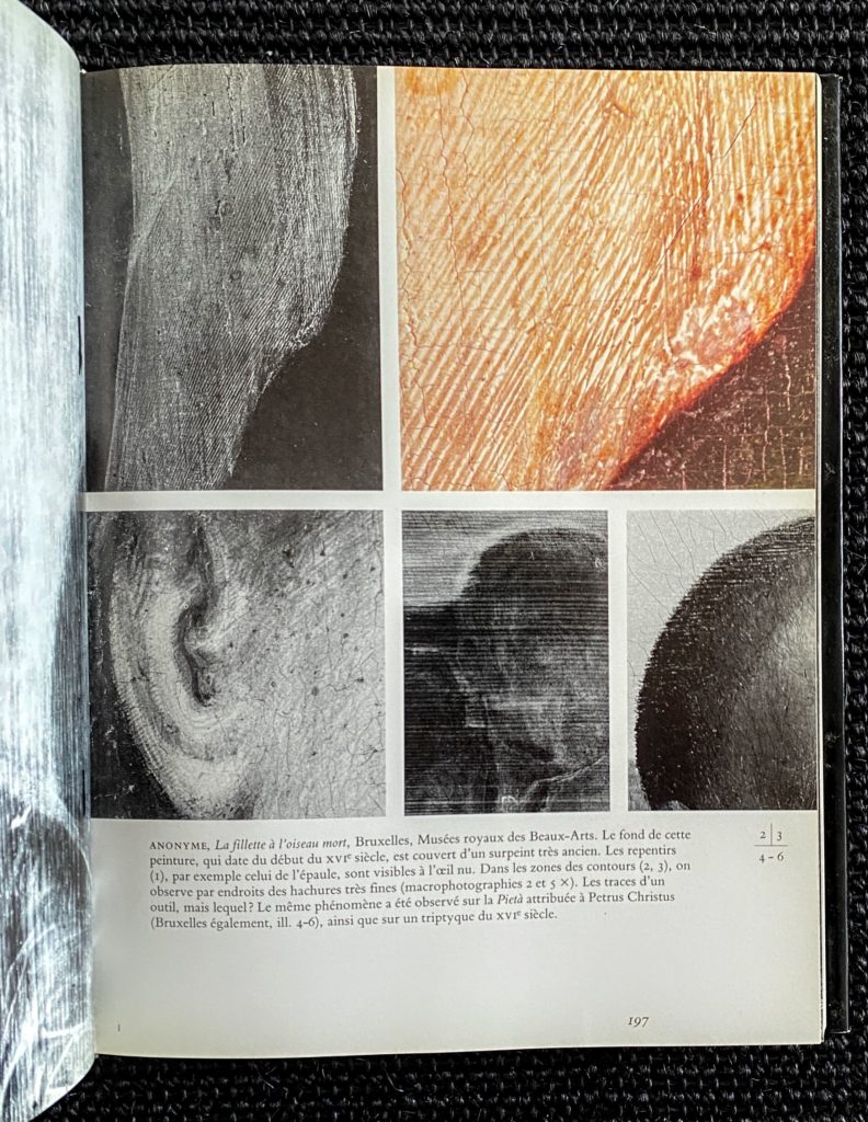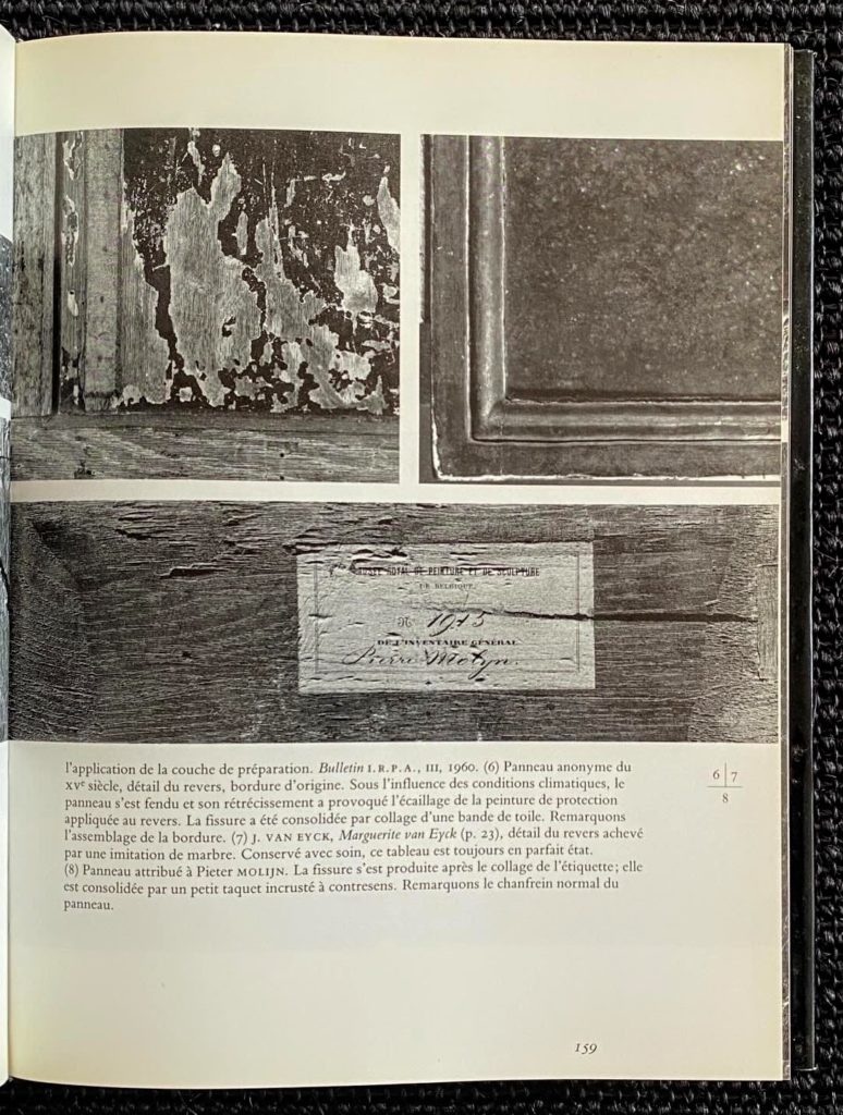 – Analyse des : support – Couches de fond- dessin sous-jacent ou ébauche – couche picturale – couche de protection – bordures – genèse – signature et inscriptions – histoire matérielle.