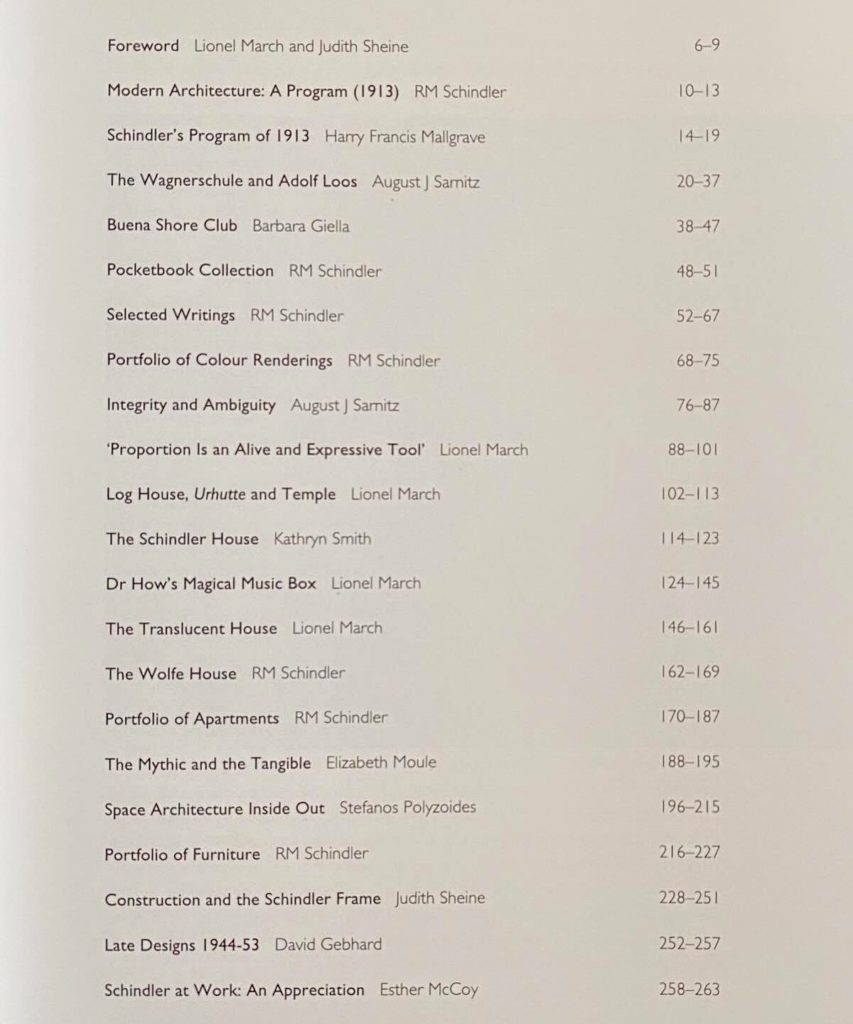 Wide selection of Schindler’s writings including a new translation of his famous manifesto of 1913 « Modern Architecture, a program ».